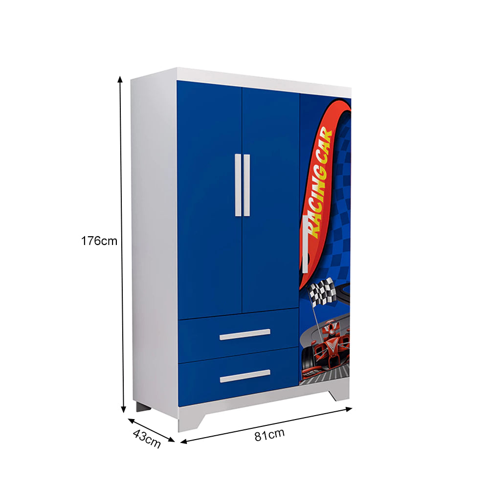 Kit Quarto Infantil Carro Azul Cama com Grade e Guarda-Roupa MDF